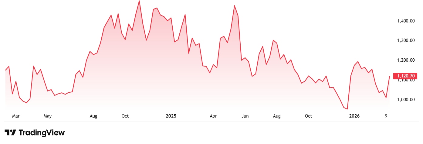 The share price of Entero Healthcare Solutions Ltd was around Rs 1,150 when listed in February 2024 and as on 20th March 2026 it was Rs 1,128.