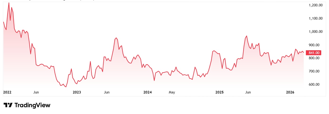 At the current price, the stock is trading at a discount of 37% from its all-time high of Rs 1,343.