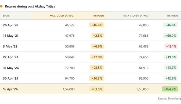 The analyst in a separate note said that gold has historically delivered around 30% returns from one Akshay Tritya cycle to the other. “Although price movements on the day itself are typically modest, the occasion has consistently marked an auspicious entry point for long-term investors,” she added.
