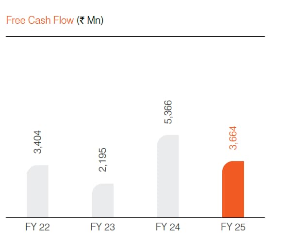 The company is debt-free, with cash reserves exceeding ₹1,000 crore as of 31 March 2025. The company consistently generates strong free cash flow, which supports its ability to pay dividends. Free Cash Flow stood at ₹366 crore in FY25, down from ₹537 crore in FY24.
