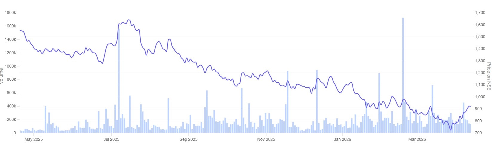 The stock had corrected by about 45% from its 52-week high level of ₹1,666 in the recent sell-off. It is currently trading around the ₹915 level, as of 17th April 2026.