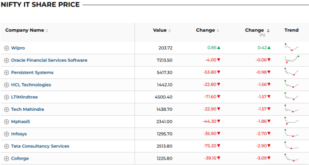 The domestic indices are trading firmly in bullish territory today (April 10) but the Nifty IT index continues to face selling pressure. In today’s trading session, the index is down around 3%, with almost all constituent stocks trading in the red, declining in the range of 1% to 3%.