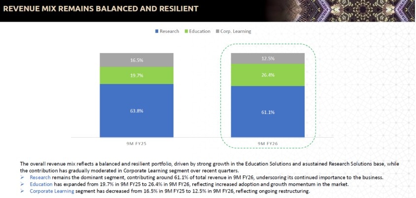 Revenue increased 3.4% year-on-year to ₹563.2 crore in 9MFY26, driven by business expansion and growth momentum in the Education Solutions segment. EBITDA grew 8.7% to ₹168.3 crore, with a 29.9% margin. Net profit grew 23.9% to ₹126.2 crore.